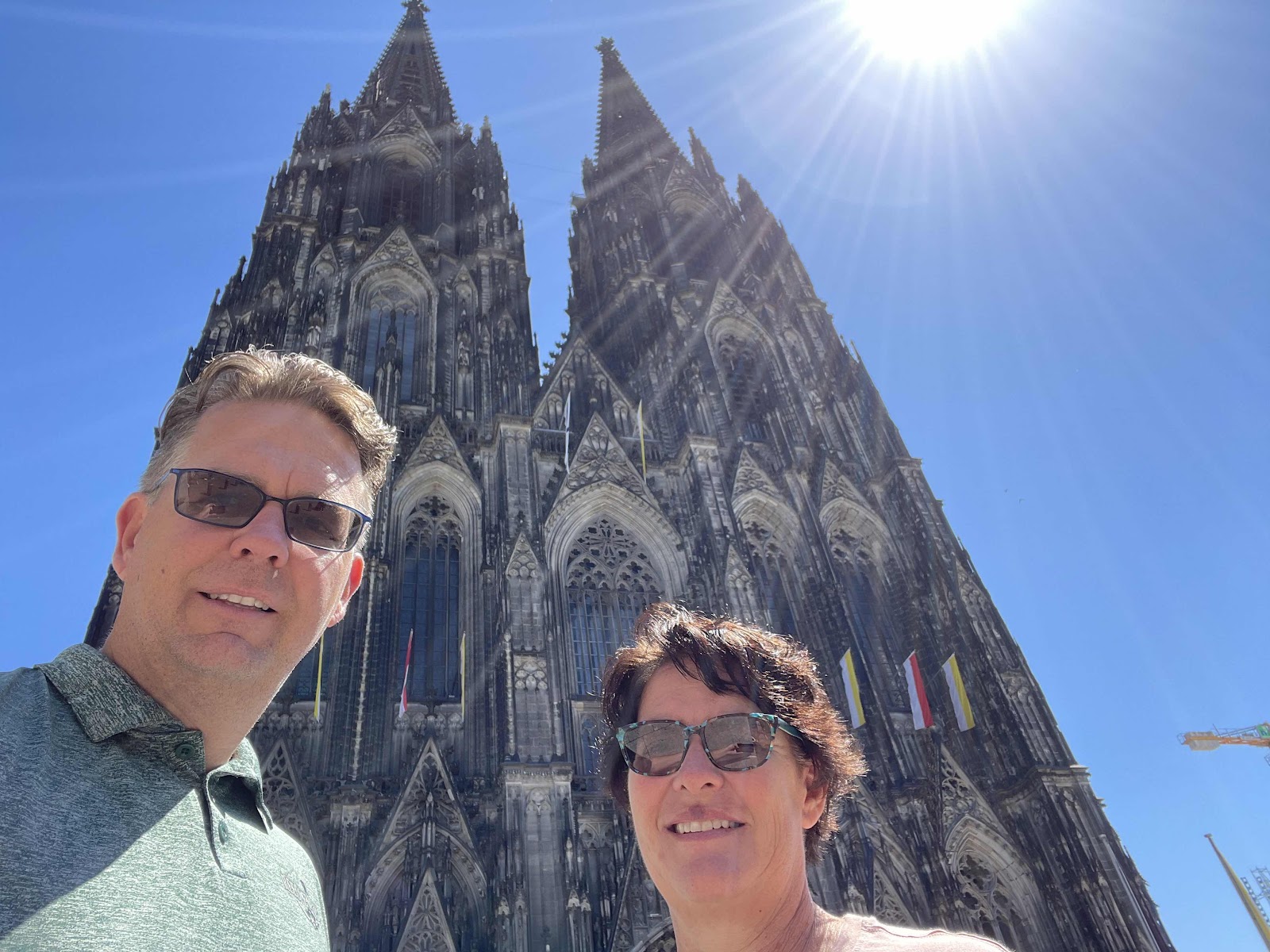 We got up and had a very nice breakfast at the location where we stayed last night. We then hopped on the road for a 2-hour drive to Cologne (spelled Köln in German), Germany. In Cologne, we parked under the cathedral and spent about an hour or so touring this magnificent church. We actually climbed 509 steps to reach the top of one of the spires. It was a heck of a climb, but once we were at the top it provided a fantastic view of the city and the Rhine river. FYI, it was just as difficult going down: tight, narrow spiraling steps. We now know what a corkscrew feels like as it spins down through the cork! We would do it again in a heartbeat!!!